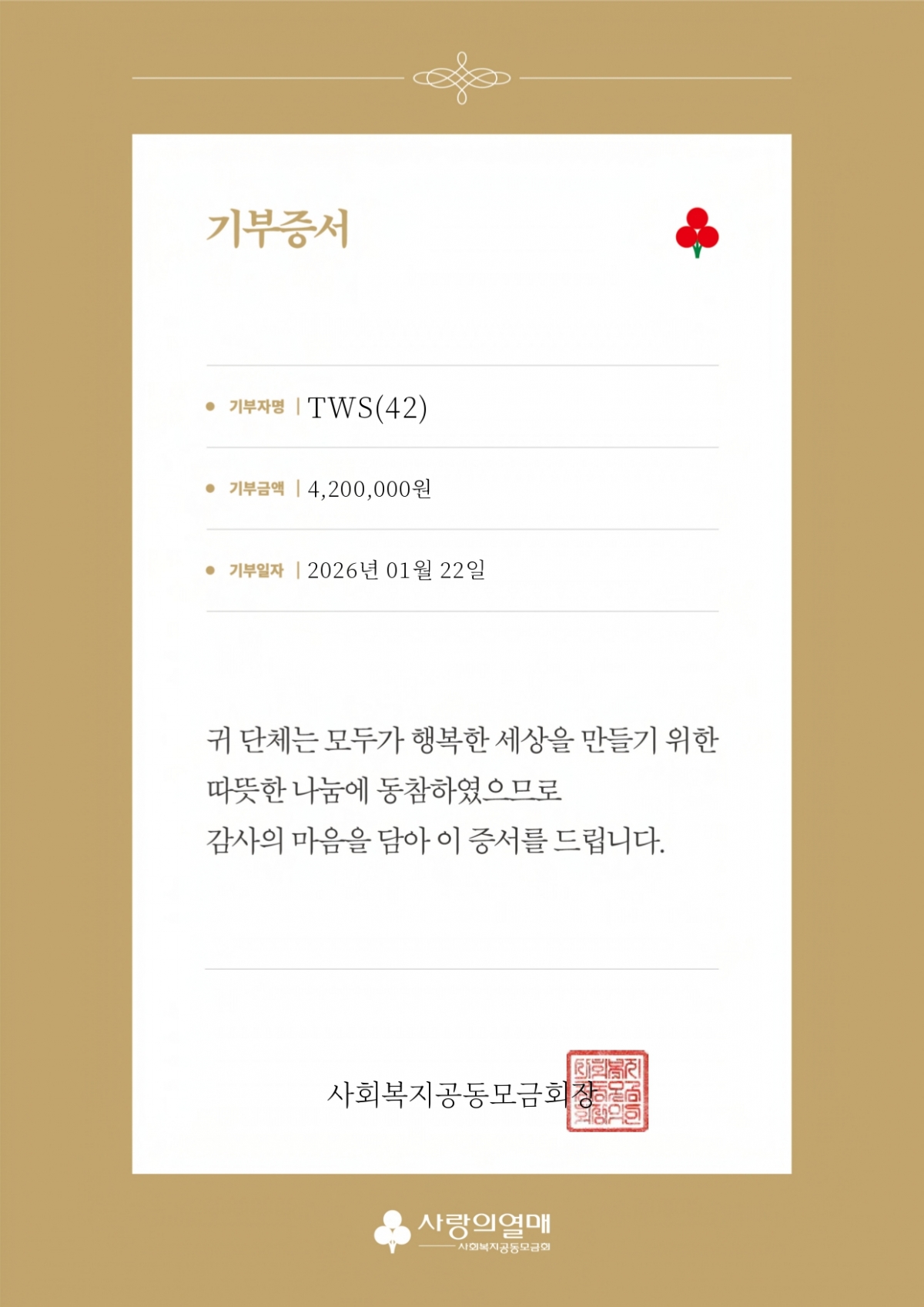 22일 사랑의열매 사회복지공동모금회는 투어스의 팬덤 '42(사이)' 내 자발적 응원 모임인 '스밍하는42'가 투어스의 데뷔 2주년을 기념해 420만 원을 기부했다고 밝혔다.