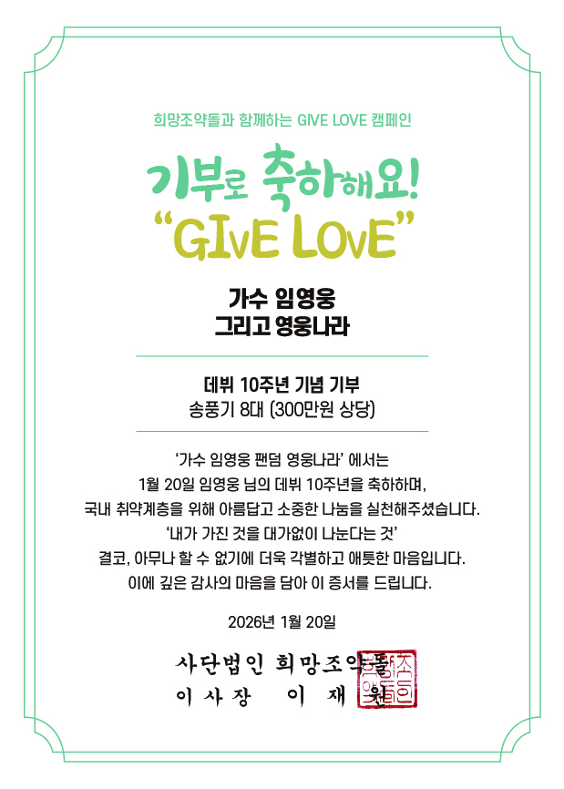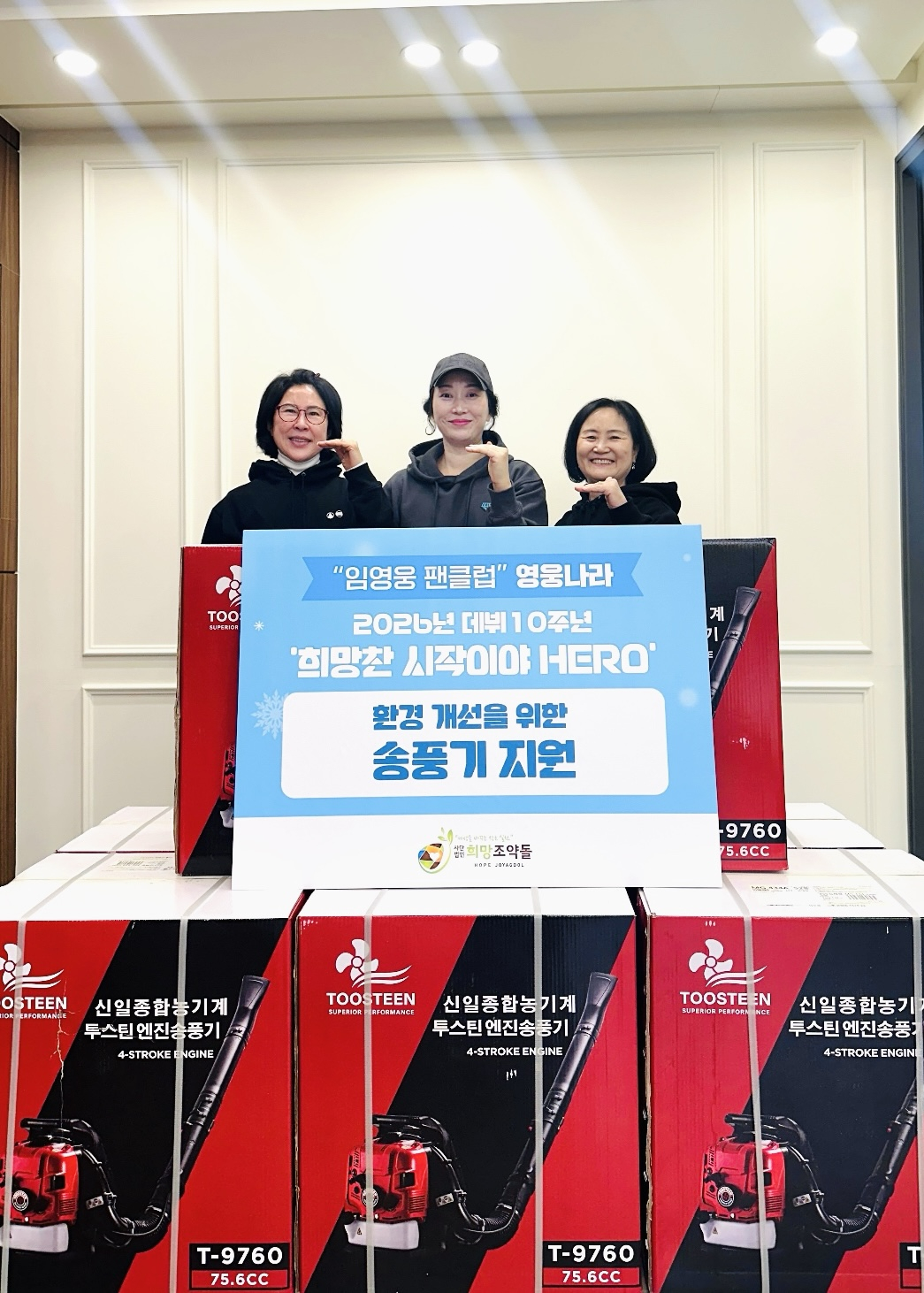 가수 임영웅의 데뷔 10주년을 맞아 팬들이 기부로 따뜻한 나눔을 실천했다. 임영웅 팬카페 영웅나라는 2026년 임영웅 데뷔 10주년을 맞아 '희망찬 시작이야 HERO'라는 슬로건으로, 1월 20일 사단법인 희망조약돌(이사장 이재원)에 300만 원 상당 송풍기 8대를 기부하며 선한 영향력을 전했다.