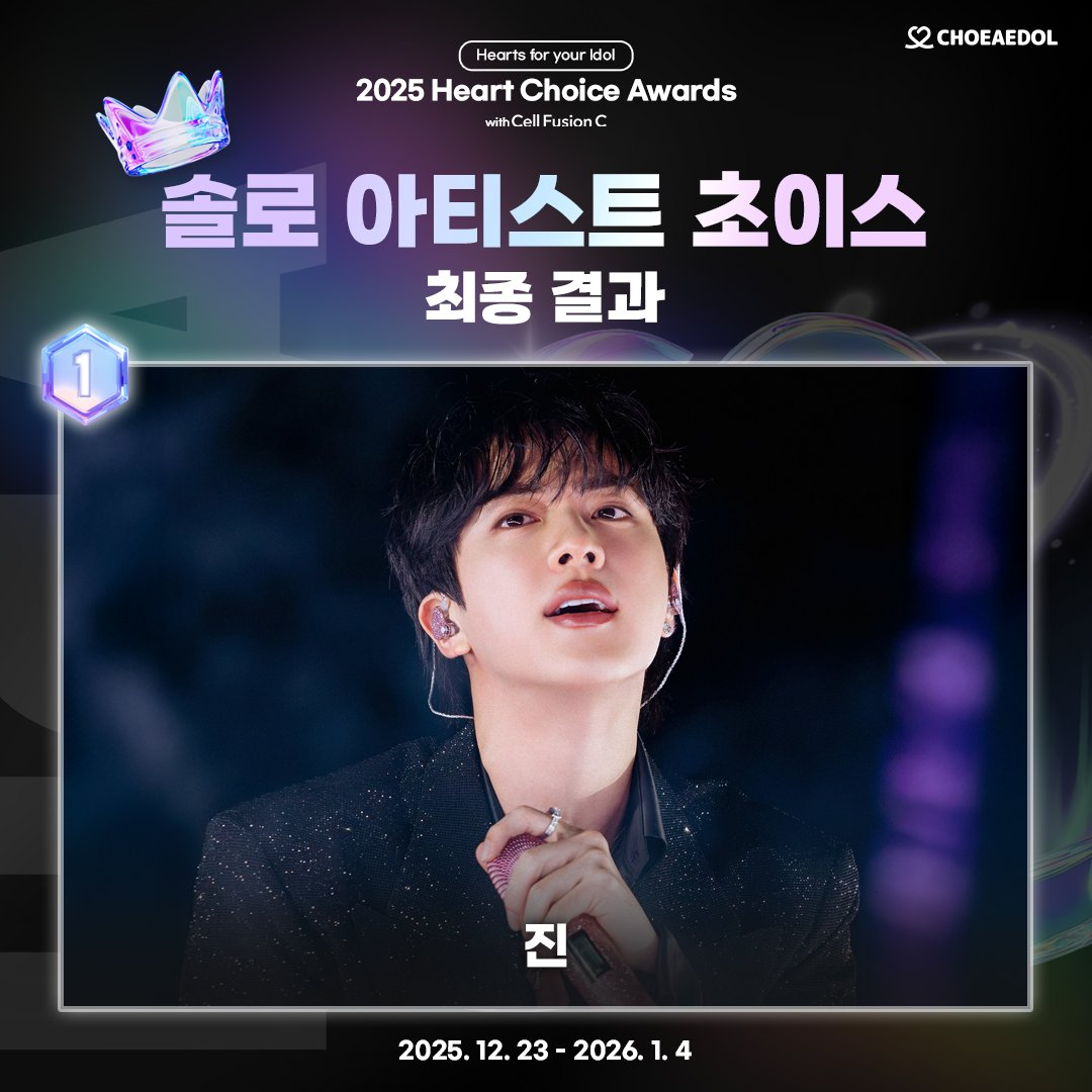 한편 진은 '2025 하트 초이스 어워즈(Heart Choice Awards)' 솔로 아티스트 초이스 부문에서 1위를 차지하며 최고의 인기를 다시 한 번 입증했다. 이에 따른 리워드 광고는 오는 1월 26일 서울 코엑스 슈페리어타워 대형 전광판을 통해 송출될 예정으로, 도심 한복판을 밝히는 진의 존재감이 다시 한 번 주목받을 전망이다.