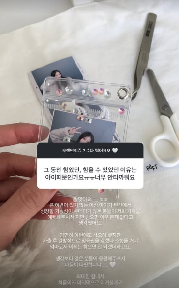 김지연은 "아빠가 훈련 가거나 오랜 시간 떨어져 있다가 만나면 알아보나요?"라는 질문에는 "비시즌 때도 집에 없으니 못 알아본다"라며 "아들한텐 너무 미안하지만 아빠 없다고 생각하고 키워야죠"라고 답했다.
