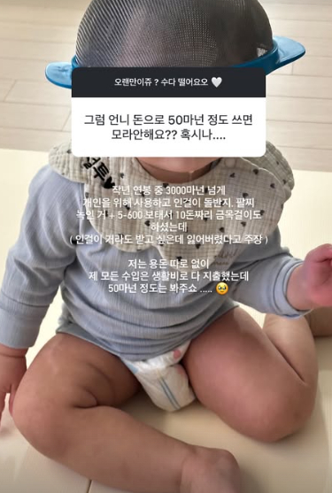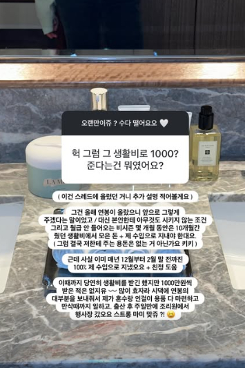 김지연은 생활비로 1000만원 준다는 것과 관련, "그건 올해 연봉이 올랐으니 앞으로 그렇게 주겠다는 말이었고 대신 본인한테 아무것도 시키지 않는 조건 그리고 월급 안 들어오는 비시즌 몇 개월 동안은 10개월간 줬던 생활비에서 모은 돈, 제 수입으로 지내야 한다고 했다. 근데 사실 이미 매년 12월부터 2월 말 전까지 100% 제 수입으로 지냈다. 이때까지 당연히 생활비를 받긴 했지만 1,000만 원씩 받은 적은 없다. 많이 효자라 시댁에 연봉의 대부분을 보내줘 제가 혼수랑 아이 용품 다 마련하고 만삭 때까지 일하고 출산 후 주일 만에 조리원에서 행사장 갔다"라고 설명했다.