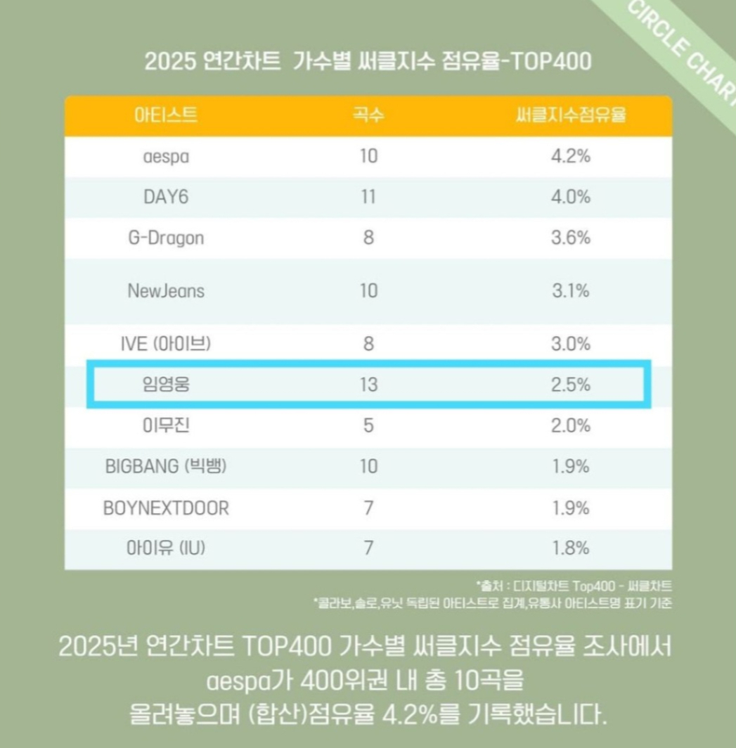 써클차트의 '가수별 점유율'은 해당 연도 TOP 400에 진입한 곡들의 써클지수(스트리밍, 다운로드, BGM 수치 등 합산)를 기반으로 산출된다. 임영웅은 지난 2024년에 이어 2025년에도 최상위권을 유지하며 반짝 인기가 아닌 '롱런'의 아이콘임을 입증했다.