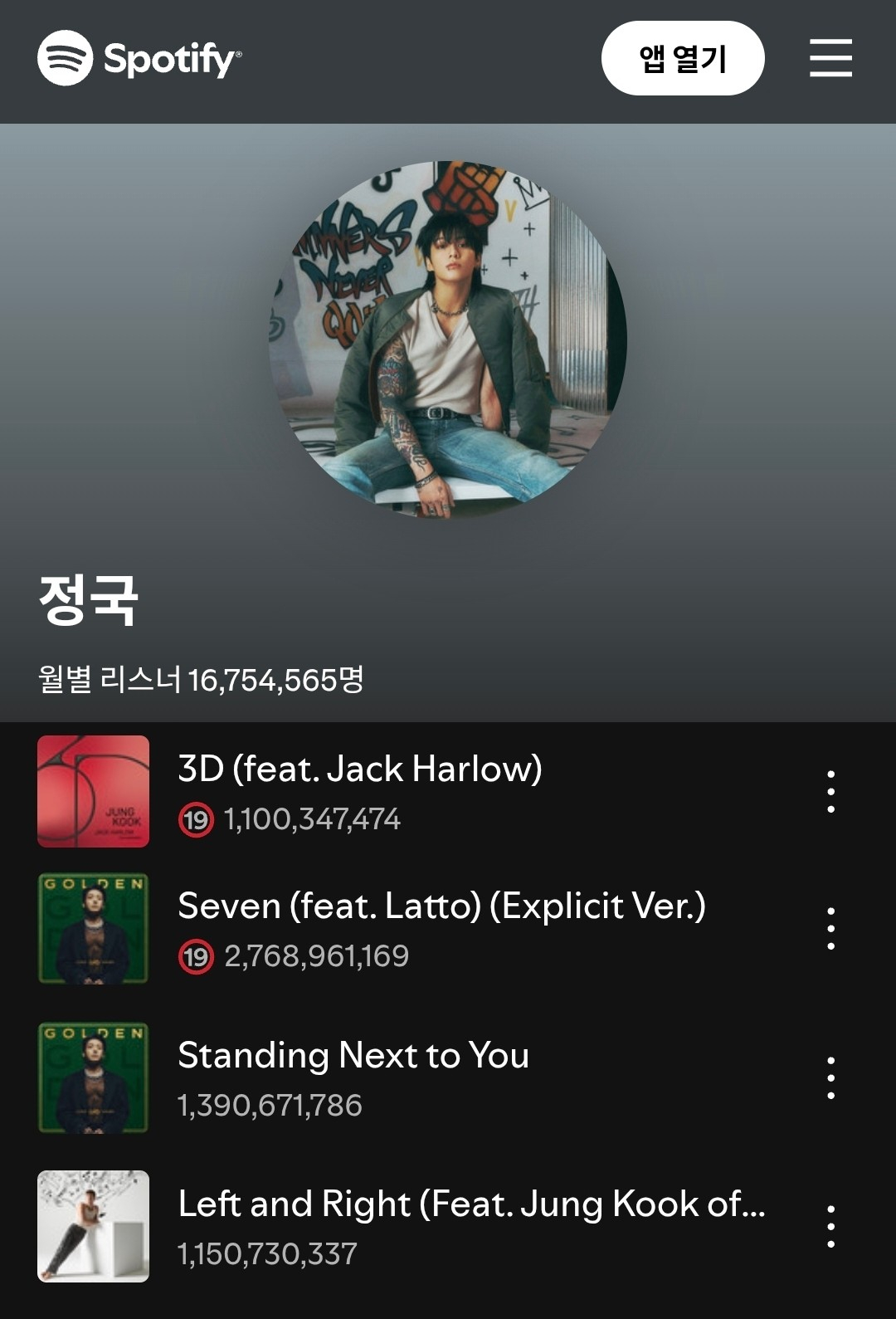 현재 정국은 '3D'를 비롯해 'Seven'(27억6000만), 'Standing Next to You'(13억8000만), 'Left and Right'(11억5000만) 등 총 4곡이 스포티파이에서 11억 스트리밍을 넘겼다.