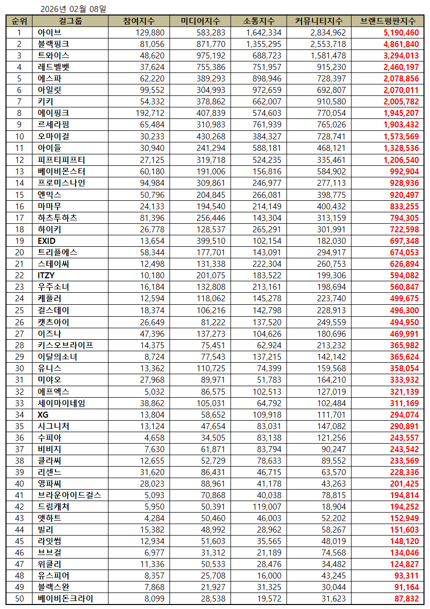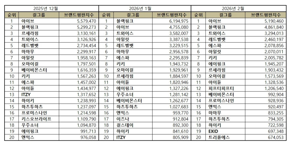 걸그룹 브랜드평판 2026년 2월 빅데이터 분석결과, 1위 아이브 2위 블랙핑크 3위 트와이스 순으로 분석됐다.한국기업평판연구소는 걸그룹 브랜드평판 빅데이터 분석을 위해 2026년 1월 8일부터 2026년 2월 8일까지 측정한 브랜드 빅데이터 45,389,287개를 분석하여 걸그룹 브랜드에 대한 참여지수, 미디어지수, 소통지수, 커뮤니티지수로 브랜드평판지수를 측정했다. 지난 1월 걸그룹 브랜드 빅데이터 52,502,090개와 비교하면 13.55% 줄어들었다.