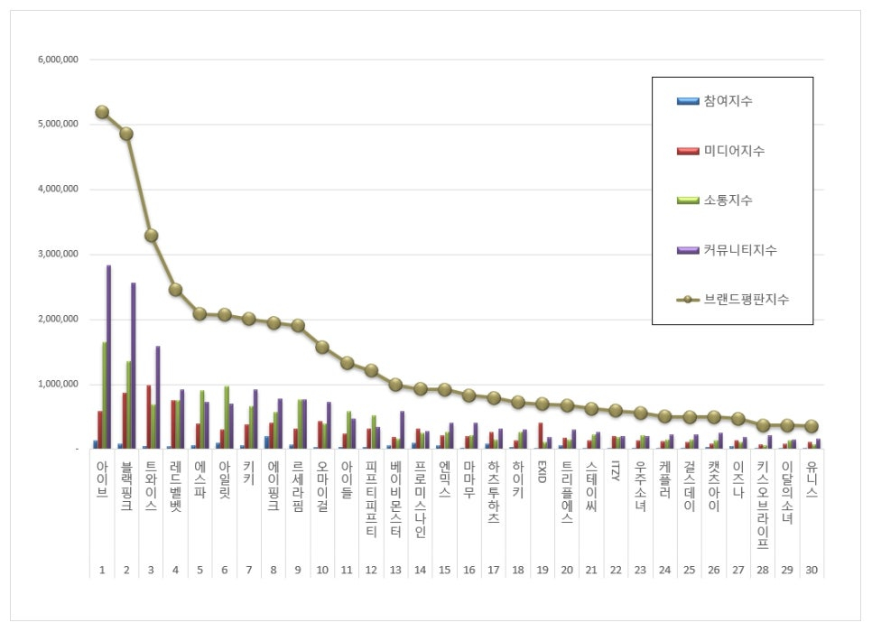 2026년 2월 걸그룹 브랜드평판 30위 순위는 아이브, 블랙핑크, 트와이스, 레드벨벳, 에스파, 아일릿, 키키, 에이핑크, 르세라핌, 오마이걸, 아이들, 피프티피프티, 베이비몬스터, 프로미스나인, 엔믹스, 마마무, 하츠투하츠, 하이키, EXID, 트리플에스, 스테이씨, ITZY, 우주소녀, 케플러, 걸스데이, 캣츠아이, 이즈나, 키스오브라이프, 이달의소녀, 유니스 순이었다.