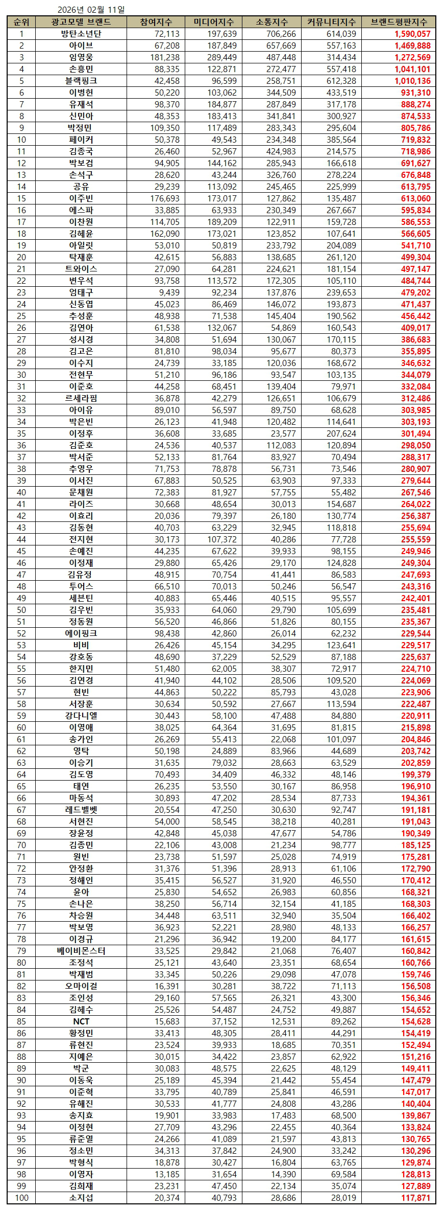 2026년 2월 광고모델 브랜드평판 30위 순위는 방탄소년단, 아이브, 임영웅, 손흥민, 블랙핑크, 이병헌, 유재석, 신민아, 박정민, 페이커, 김종국, 박보검, 손석구, 공유, 이주빈, 에스파, 이찬원, 김혜윤, 아일릿, 탁재훈, 트와이스, 변우석, 엄태구, 신동엽, 추성훈, 김연아, 성시경, 김고은, 이수지, 전현무 순으로 분석됐다.