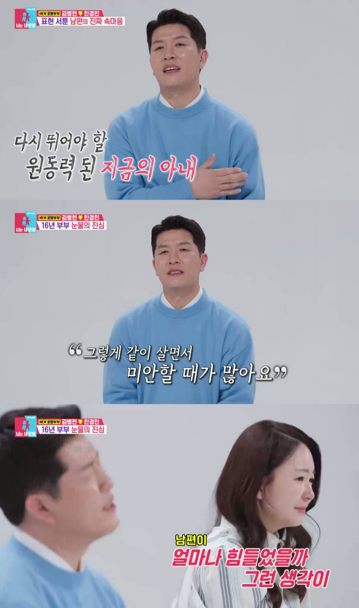 이에 김병현은 미국 생활을 하며 정말 힘들었던 시기, 아내 덕분에 다시 야구를 할 결심을 하게 됐다며 "표현이 서툰 사람이라 미안하다"고 말했다. 김병현은 "인생의 파도를 넘긴 적도 있고 그렇게 같이 살면서 미안할 때가 많다"며 서툰 표현 속 애정 가득한 진심을 드러냈다. 이에 한경민은 힘들었을 남편을 생각하며 눈물을 흘리며 "바보 같아 보여도 속이 깊은 사람이라고 느껴진다. 가족이라서가 아니라 잘 됐으면 좋겠다"고 깊은 애정을 드러냈다. 이에 김병현은 무뚝뚝한 듯하지만 자신의 방식으로 아내를 다정하게 달랬고, 한경민은 환한 웃음을 보였다.