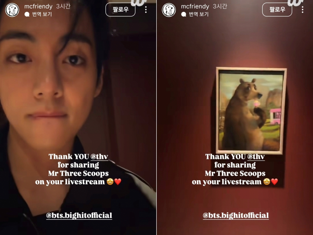 한편 뷔의 새집을 장식한 그림의 작가 앨리슨 프렌드는 인스타그램에 "세상에! 조용히 앉아서 그림을 그리고 있었는데 갑자기 DM이 쏟아지기 시작했어요. 알고 보니 아이스크림을 사랑하는 이 친구가 뷔의 라이브방송에 특별출연했어요! 정말 신나요! 'Mr Three Scoops'(그림 제목)가 새집에 정착한 걸 보니 정말 기뻐요"라고 흥분을 감추지 못했다.