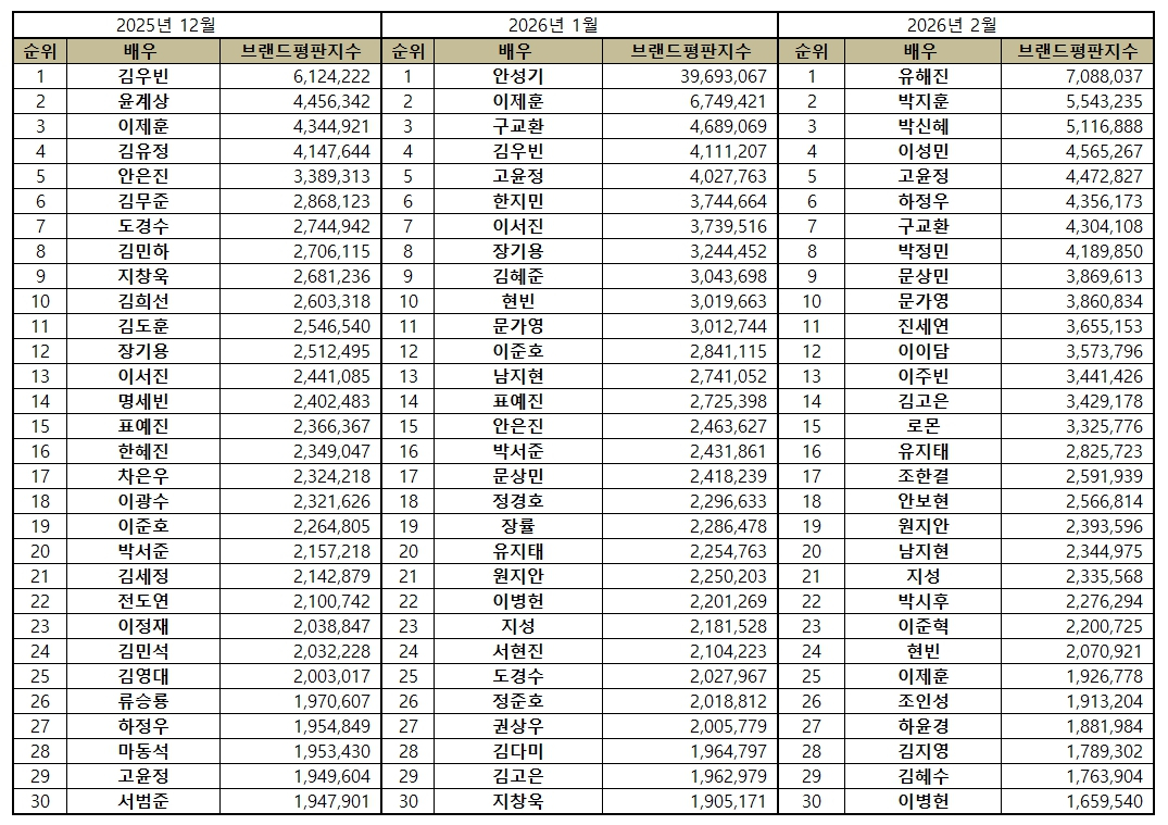 2026년 2월 배우 브랜드평판 30위 순위는 유해진, 박지훈, 박신혜, 이성민, 고윤정 , 하정우, 구교환, 박정민, 문상민, 문가영, 진세연, 이이담, 이주빈, 김고은, 로몬, 유지태, 조한결, 안보현, 원지안, 남지현, 지성, 박시후, 이준혁, 현빈, 이제훈, 조인성, 하윤경, 김지영, 김혜수, 이병헌 순이었다. 1위, 유해진 브랜드는 참여지수 2,152,323 미디어지수 2,256,100 소통지수 1,361,811 커뮤니티지수 1,317,803이 되면서 브랜드평판지수 7,088,037로 분석됐다.