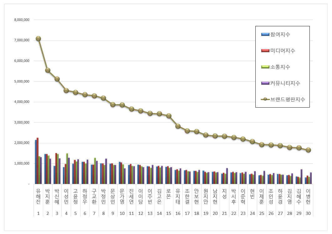 2위, 박지훈 브랜드는 참여지수 1,457,797 미디어지수 1,467,155 소통지수 1,386,889 커뮤니티지수 1,231,393이 되면서 브랜드평판지수 5,543,235로 분석됐다.