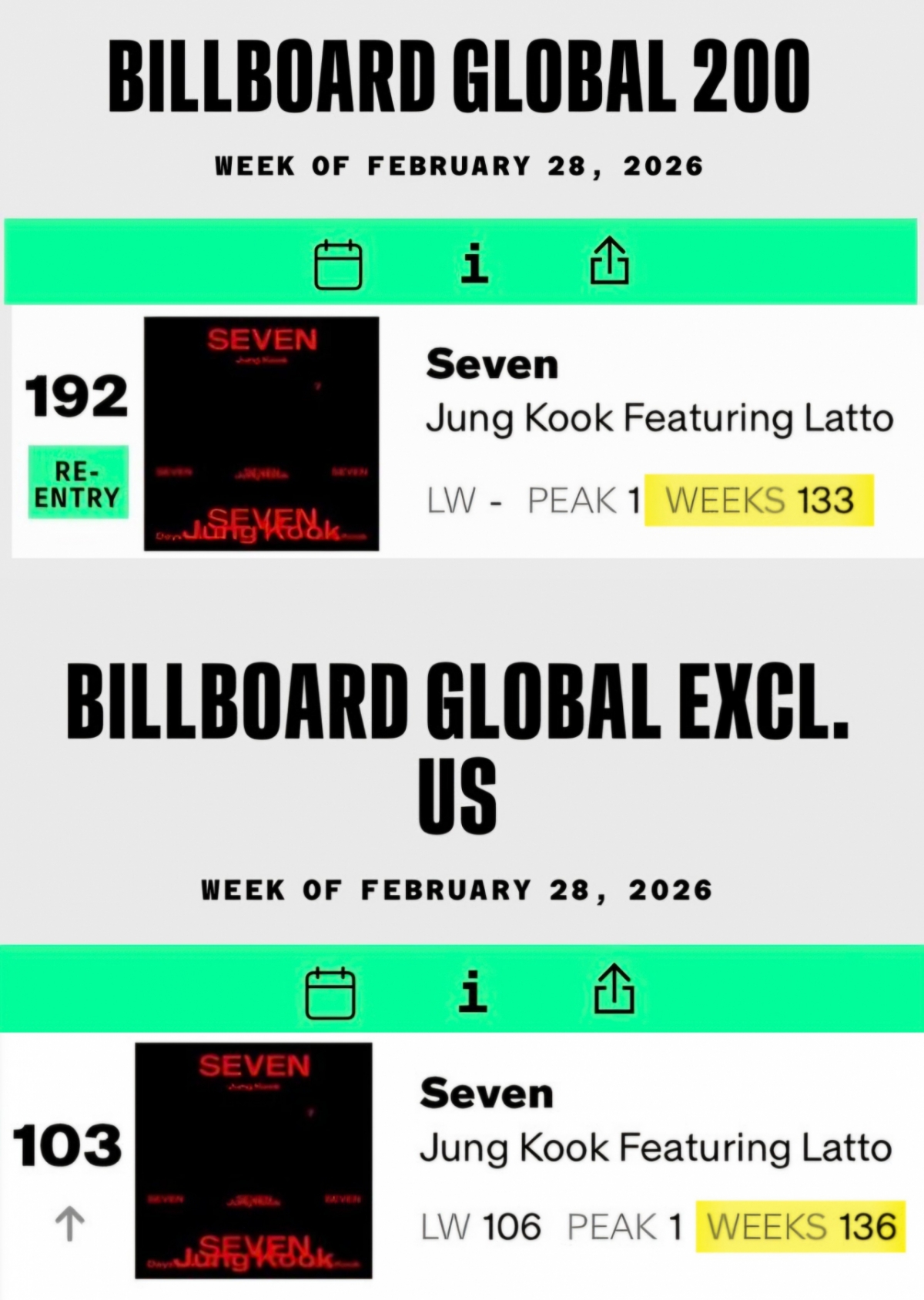 'Seven'은 빌보드 '글로벌 200' 차트에 재진입하며 아시아 그룹 및 솔로 가수를 모두 통틀어 최초이자 최장 기간인 133주 진입을 달성했다. 또한 'Seven'은 같은 날짜 빌보드 '글로벌(미국 제외)' 차트에서 103위에 오르며 아시아 솔로 가수로서 136주 동안 차트인을 이어가 신기록을 세웠다.