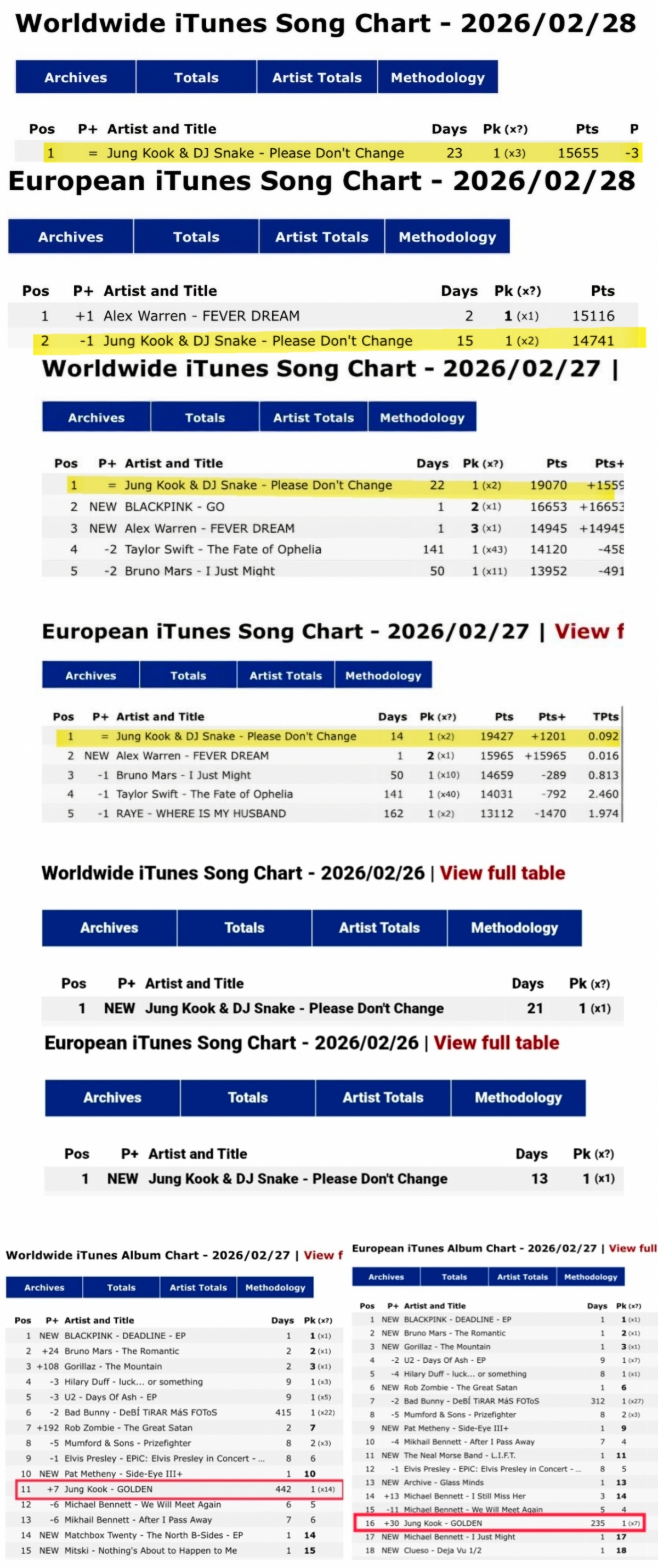 정국의 앨범 'GOLDEN'은 월드와이드와 유러피안 아이튠즈 앨범 차트에서 각각 11위와 16위를 기록했다. 또한 두 차트에서 K-팝 솔로 가수 음반 중 최장 기간인 통산 442일과 235일 동안 머물렀다.'Please Don't Change'는 스포티파이(Spotify)에서 2억 1900만 스트리밍을 돌파했다. 아울러 'GOLDEN'은 스포티파이 아시아 가수 정규 앨범 중 최다 누적 스트리밍인 67억 9000만 회를 달성해 68억 돌파를 앞두고 있다.