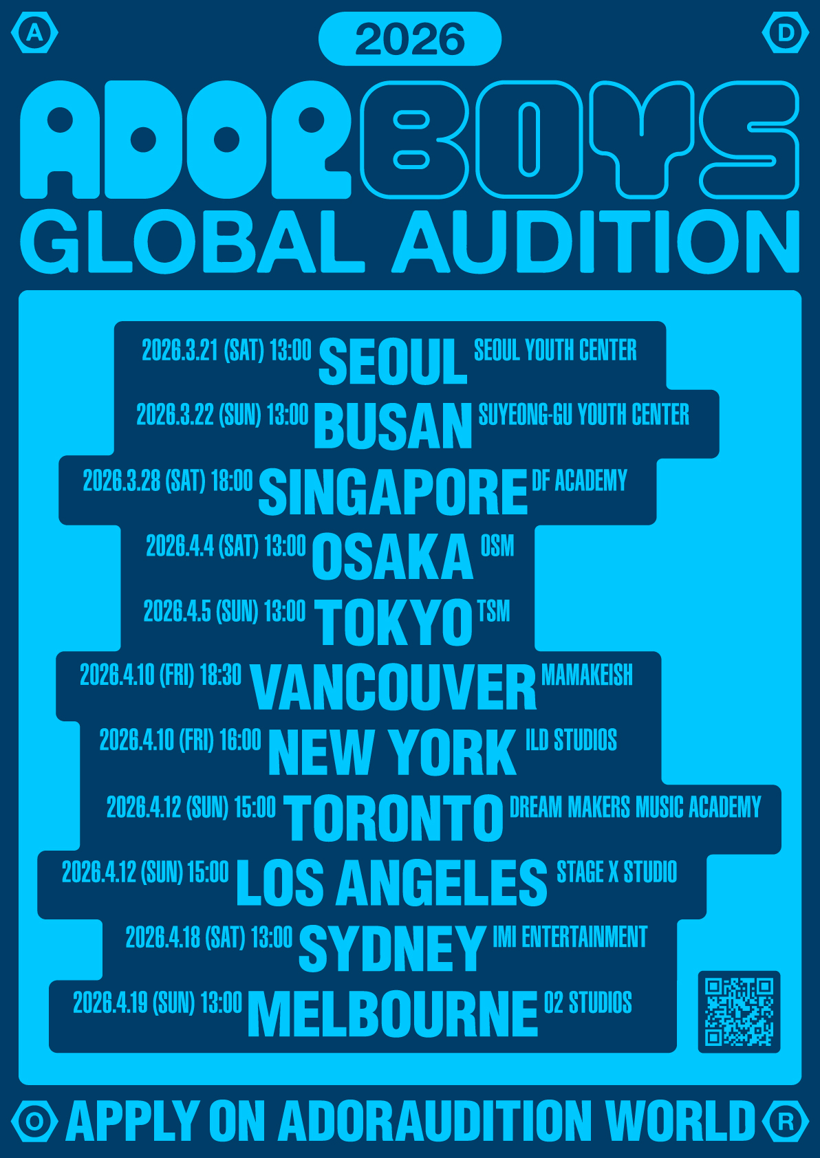 '2026 ADOR BOYS GLOBAL AUDITION(2026 어도어 보이즈 글로벌 오디션)'은 2007년 이후 출생한 남자라면 누구나 지원 가능하다. 지원 분야에 제한은 없다. 노래, 춤, 랩, 연기, 작사·작곡, 브이로그, 사진 등 자신의 장점을 보여줄 수 있는 콘텐츠가 있다면 무엇이든 제출할 수 있다.