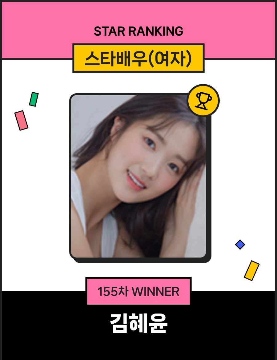 배우 김혜윤이 스타랭킹 여자 배우 부문에서 1위를 수성했다.김혜윤은 3월 5일 오후 3시 1분부터 3월 12일 오후 3시까지 진행된 155차 스타랭킹 스타배우 여자 랭킹 투표에서 2만 338표를 획득하며 1위에 이름을 올렸다.