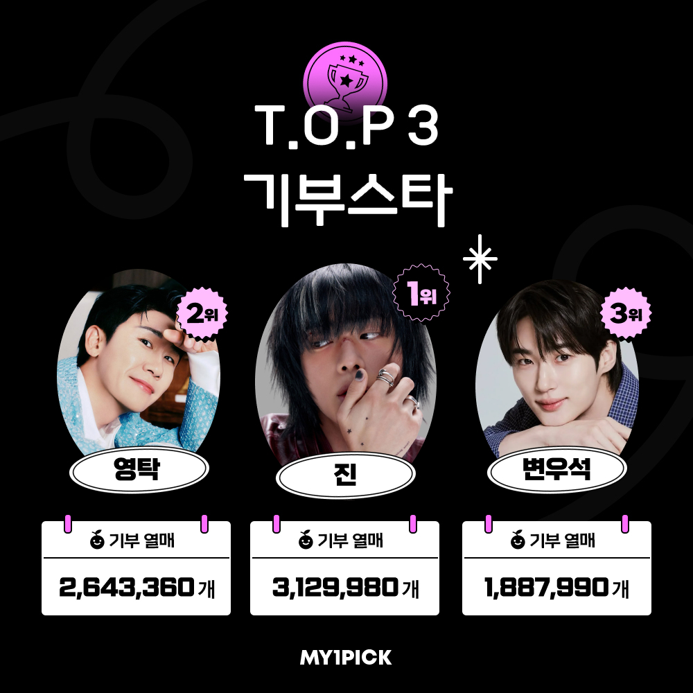 진은 2025년 한 해 동안 마이원픽 기부스타 TOP10을 꾸준히 유지하며 총 7차례 TOP3에 오르는 등 꾸준한 존재감을 보여왔다. 팬들의 참여로 완성된 기부는 진이 전하는 긍정적인 메시지를 더욱 분명하게 전한다.