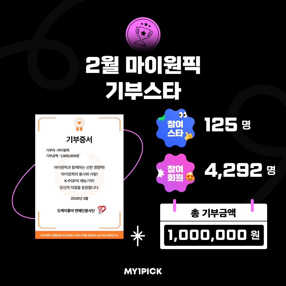 마이원픽에 따르면 지난 2월 기부에는 125명의 스타와 4292명의 팬이 참여해 총 100만 원의 기부금이 조성됐다. 해당 기부금은 '오케이좋아 연예인봉사단'을 통해 전달돼 사랑의 푸드트럭 운영, 도시락 배달 서비스, 효도잔치 공연, 지방 봉사단체와의 자매결연, 재난 피해 현장 봉사 등 다양한 사회공헌 활동에 사용될 예정이다.