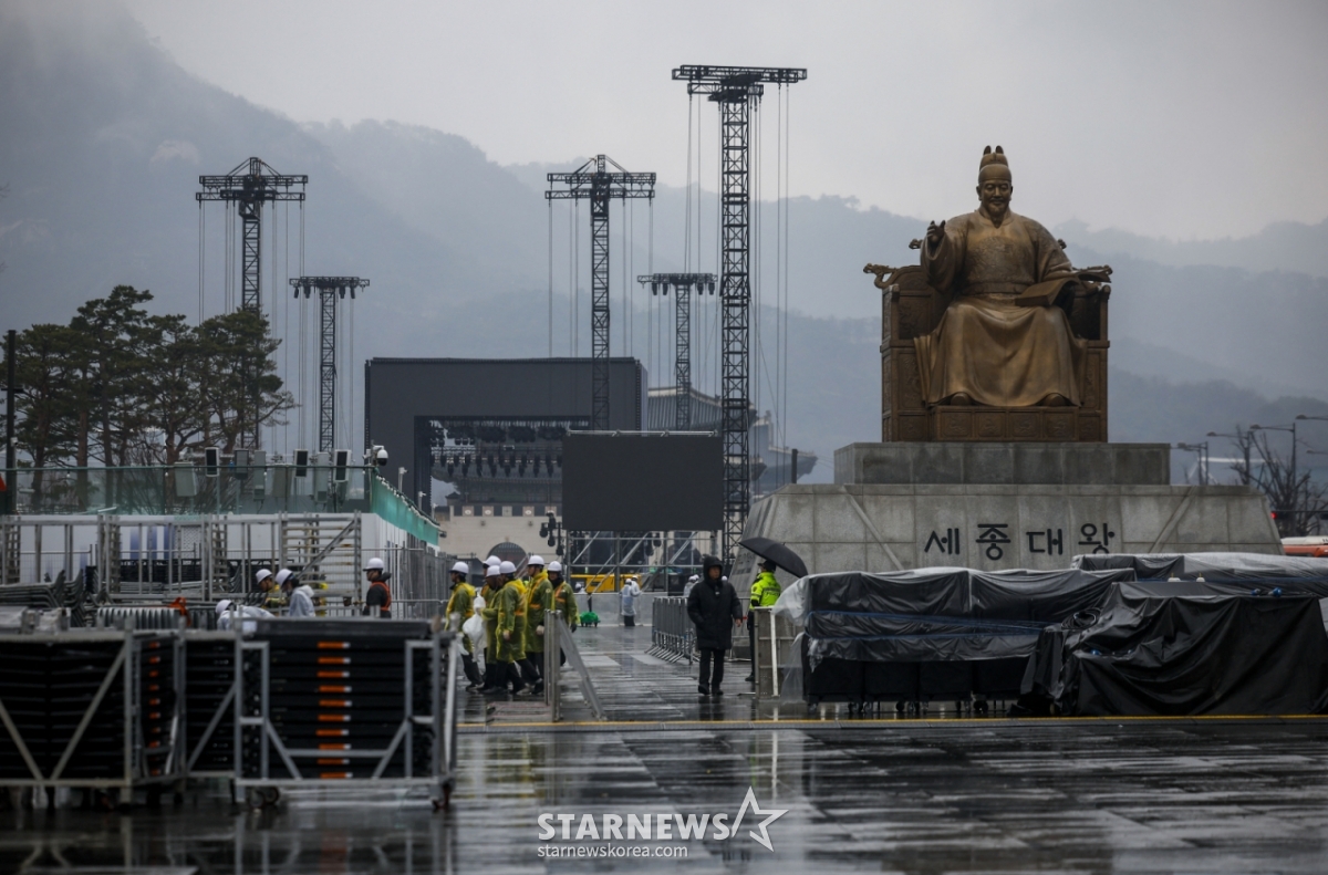 메인 무대는 세종대왕 동상 뒤 편에 자리잡았다. 그 너머로 펼쳐진 광화문 전경과 고층 건물, 공연 시설 등이 어우러지며 인상적인 무대 연출이 완성되고 있다. 전통과 현대가 공존하는 이색적인 풍경은 국내외 팬들과 관광객들의 이목을 끌기에 충분하다.