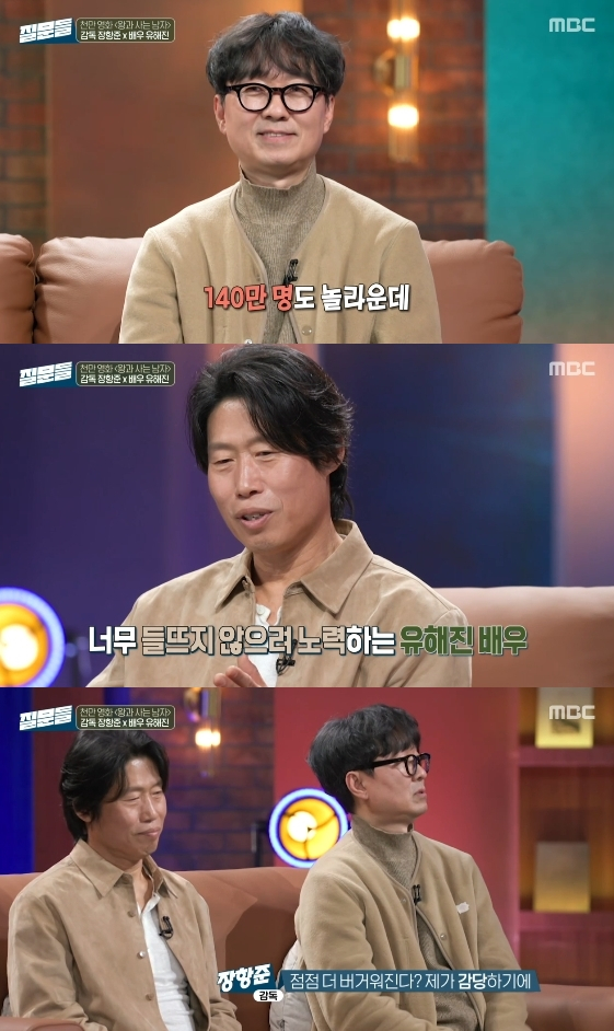 이에 유해진은 "제가 이제 그만 좀 벗어나라고 잔소리하는데 같이 있으면 늘 체크하더라. 계속 보면 좋냐고 하면 '응, 좋아'라고 한다"라고 설명해 현장을 웃음바다로 만들었다. 그는 "저도 좋긴 하지만 스스로를 다운시키려고 노력한다. 근데 장항준은 되게 즐기고 있는 것 같다"라고 말했다.