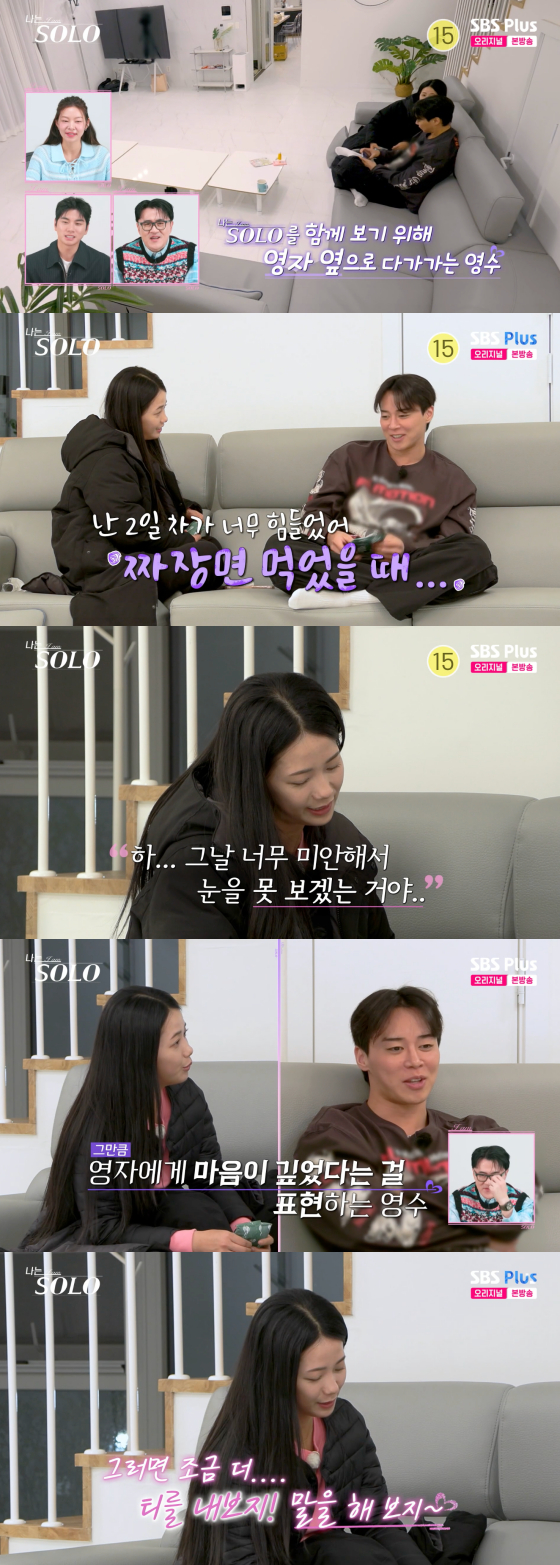 이내 영수는 영자 옆으로 자리를 옮겨 대화를 이어갔다. 영수는 "짜장면 먹은 날이 정말 힘들었다. 영자가 나를 선택하지 않았다는 게 너무 우울했다"고 털어놨다.
