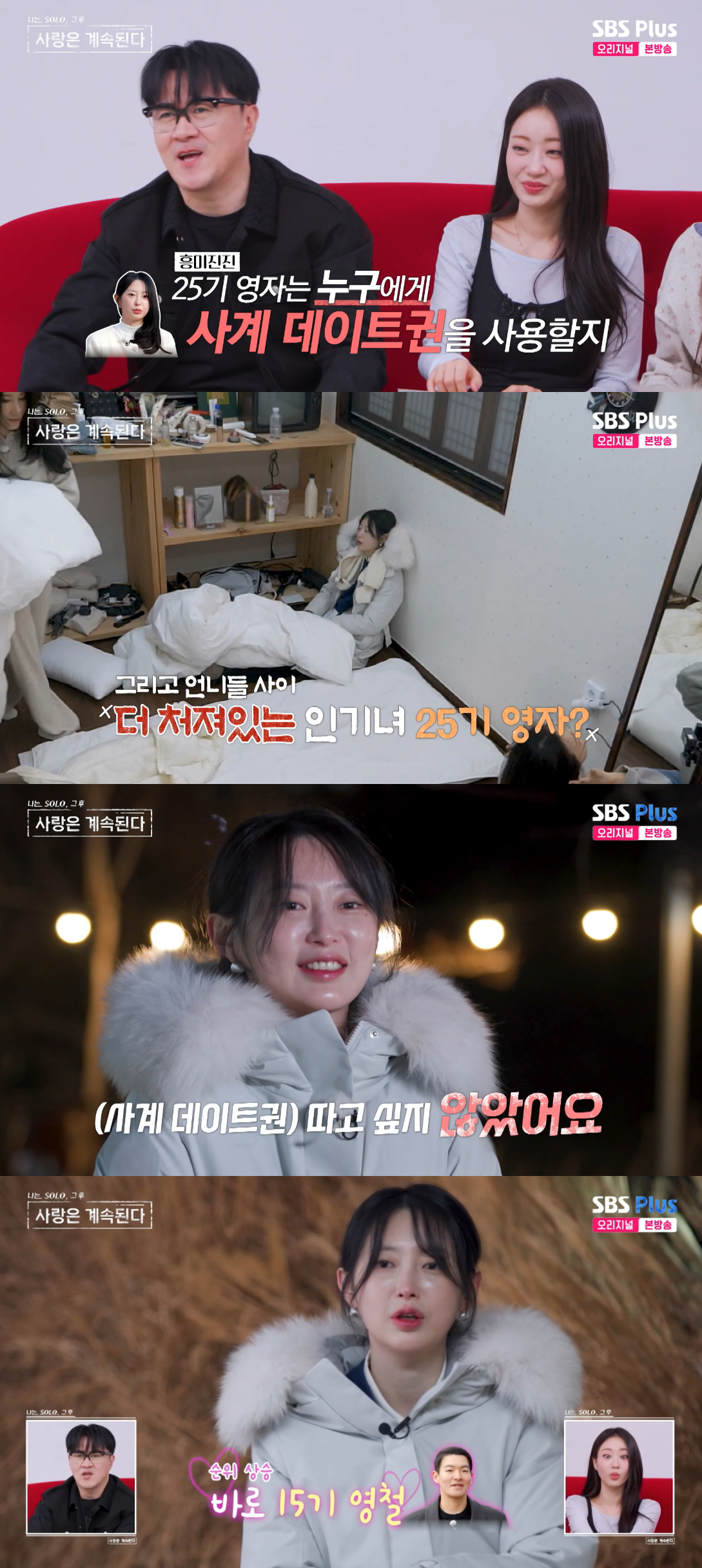 '나솔사계' 25기 영자가 사계 데이트를 앞두고 착잡해했다. 23일 방송된 SBS플러스·ENA 예능 프로그램 '나는 솔로, 그 후 사랑은 계속된다'(이하 '나솔사계')에서는 '솔로민박-한 번 더 특집' 속 솔로남녀 10인의 이야기가 그려졌다.