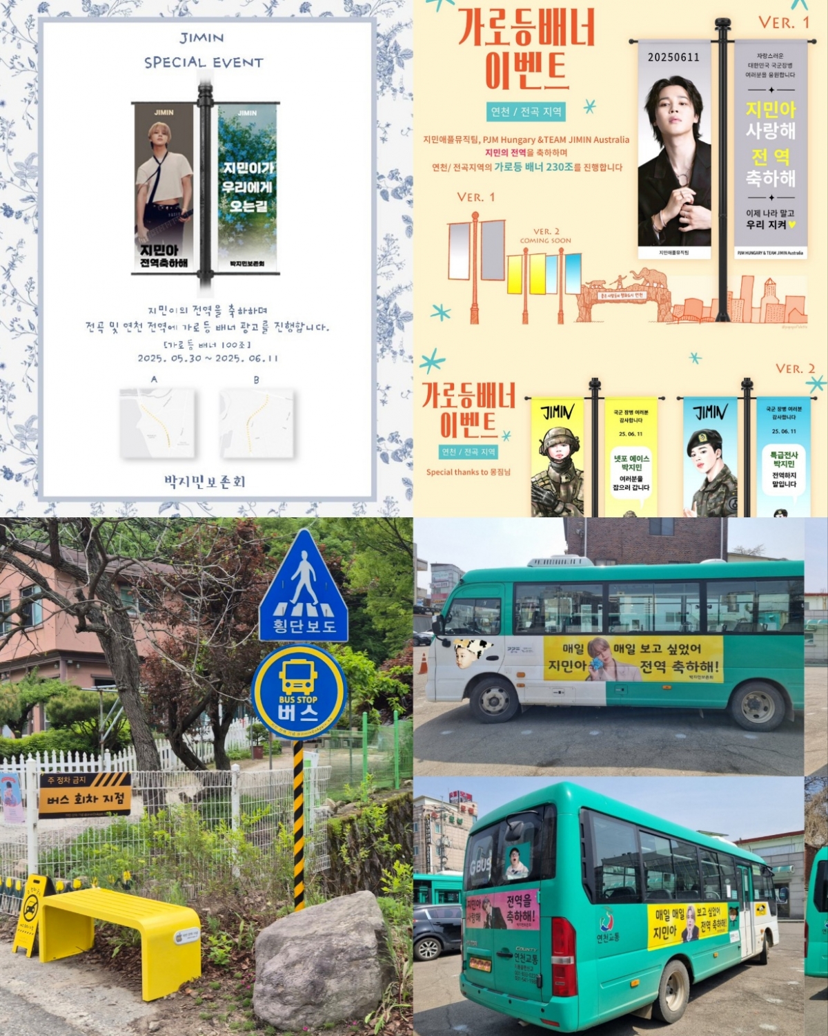 '박지민보존회'는 5월 30일부터 6월 11일까지 가로등 배너 100 세트를 내걸 예정이며 또다른 팬 연합 '지민 애플뮤직팀'은 지민의 해외 팬베이스 'PJM Hungary', 'TEAM JIMIN AUSTRALIA'와 함께 230 세트의 가로등 배너 광고로 지민을 응원한다.