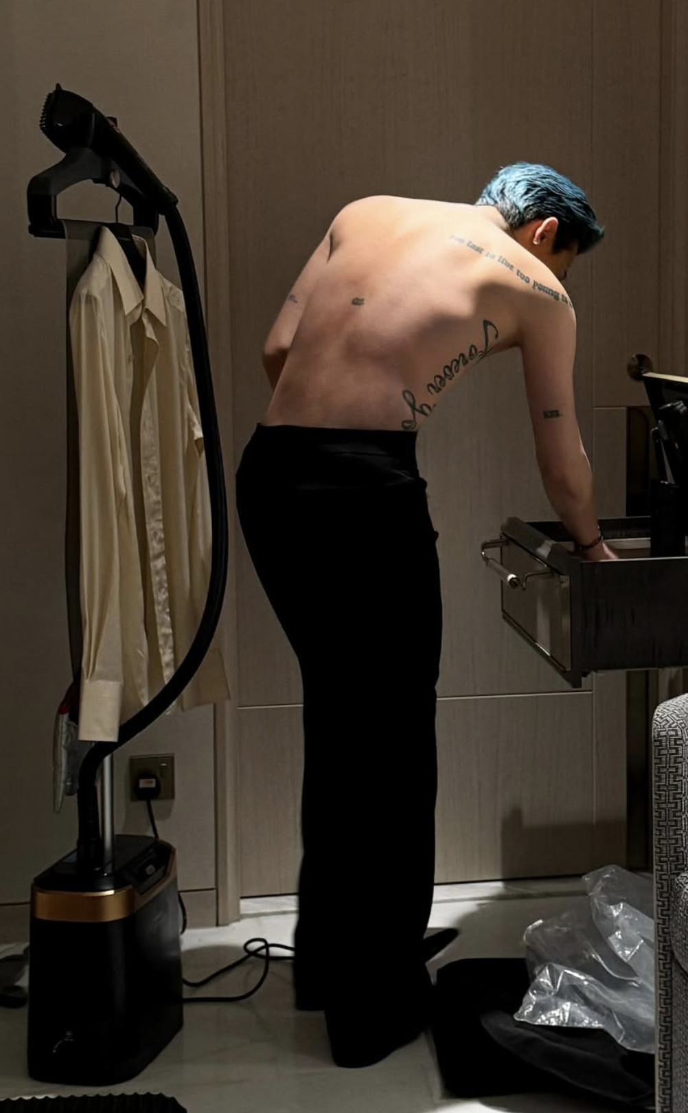 공개된 사진 속 지드래곤은 상의를 벗고 탄탄한 등근육을 드러내며 남다른 카리스마를 발산했다. 파란색으로 염색한 헤어와 대비되는 건강한 구릿빛 피부, 넓은 어깨와 선명한 근육 라인이 눈길을 사로잡았다.