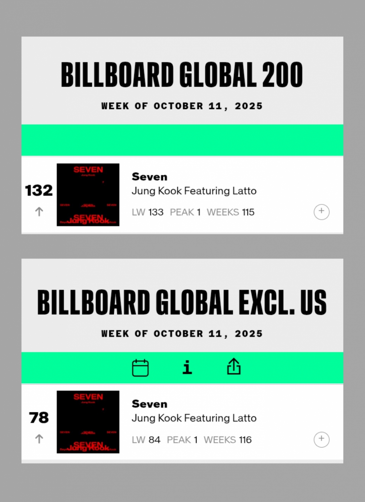 앞서 'Seven'은 빌보드 '글로벌(미국 제외)'에서 9주 연속 1위, '글로벌 200'에서 7주 연속 1위에 올랐고 두 차트에 역대 아시아 가수곡 최초이자 최장 기간인 7주 연속 동시 1위를 달성하는 역대급 대기록도 썼다.