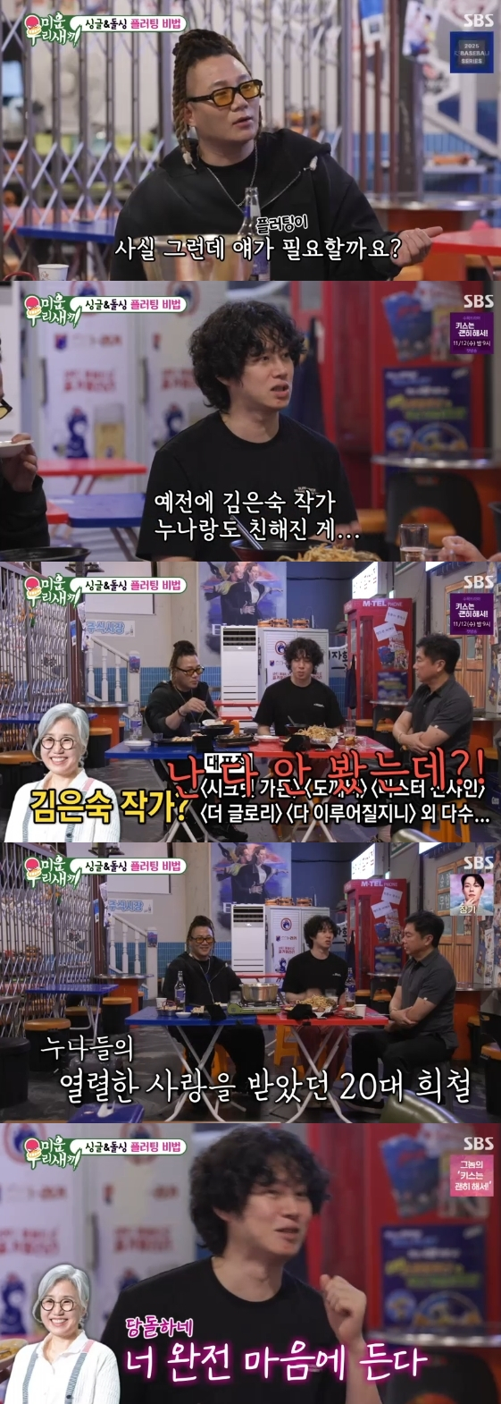 그러자 김희철은 "내가 버르장머리 없어질 수밖에 없었던 게 가만히 앉아 있으면 닭똥집도 먹여주고 술도 먹여줬다"라고 고백해 모두를 당황케 했다. 그런가 하면 김희철은 과거 김은숙 작가와 첫 만남에서 충격적인 한마디를 건넸다고 밝혀 현장을 술렁이게 했다, 그는 "김은숙 작가와 10년 전에 술자리에서 만났다. 대표작을 다 안 봤다고 했더니 '너 완전 맘에 든다'고 하시면서 친해졌다. 너무 나를 둥가둥가 해줬다"라고 설명해 감탄을 자아냈다.