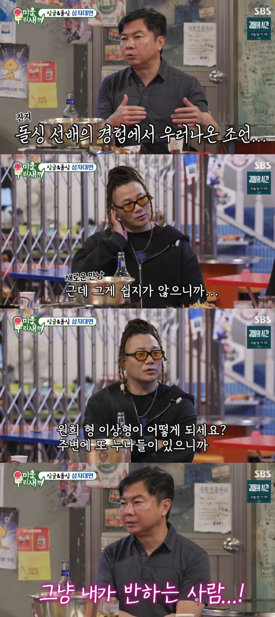 이날 12년 차 돌싱 임원희는 새내기 돌싱 윤민수에게 "새로운 사람 만날 생각은 있느냐"라고 물었다. 이에 윤민수가 없다고 고개를 젓자 임원희는 "내가 3년 동안은 생각을 안 했는데 4~5년 차쯤에 '만나 볼까?'라고 생각했다. 그때는 나이가 들어서 이미 늦었더라. 47~48살쯤이었다"라고 푸념했다.