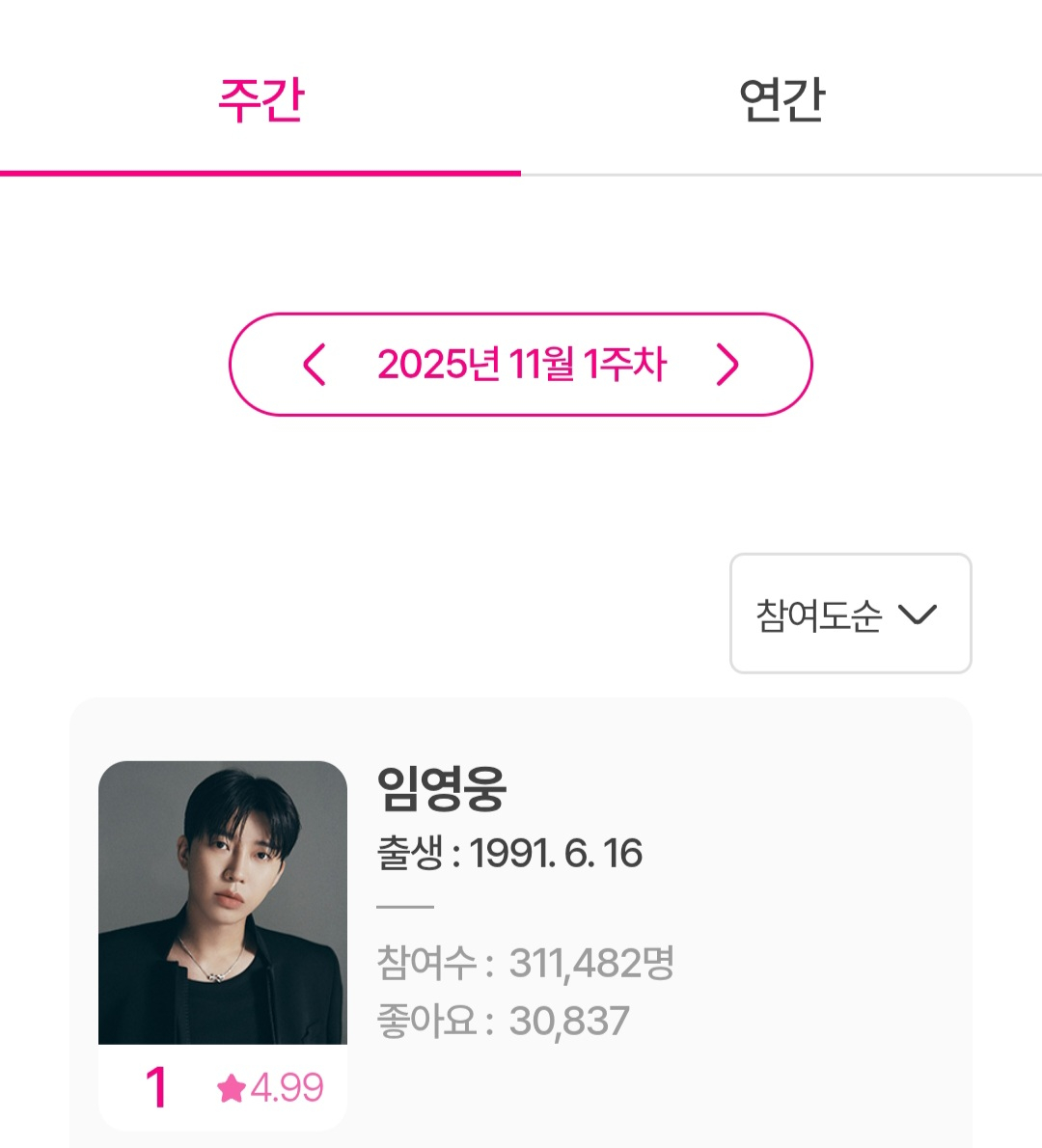 가수 임영웅이 아이돌차트 평점랭킹 241주 연속 1위에 오르며 기록 행진을 이어갔다. 임영웅은 11월 3일부터 11월 9일까지 집계된 11월 1주차 아이돌차트 평점랭킹에서 31만 1482표를 얻어 1위를 차지했다.