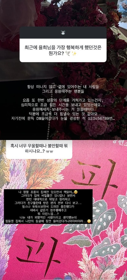 이어 "응원 메시지 보내주시는 거 읽을 때마다 덕분에 조금씩 더 힘낼 수 있는 것 같다. 자기 전에 문득 DM 들어갔다가 눈물 광광한 적 123456789번"이라고 전했다.