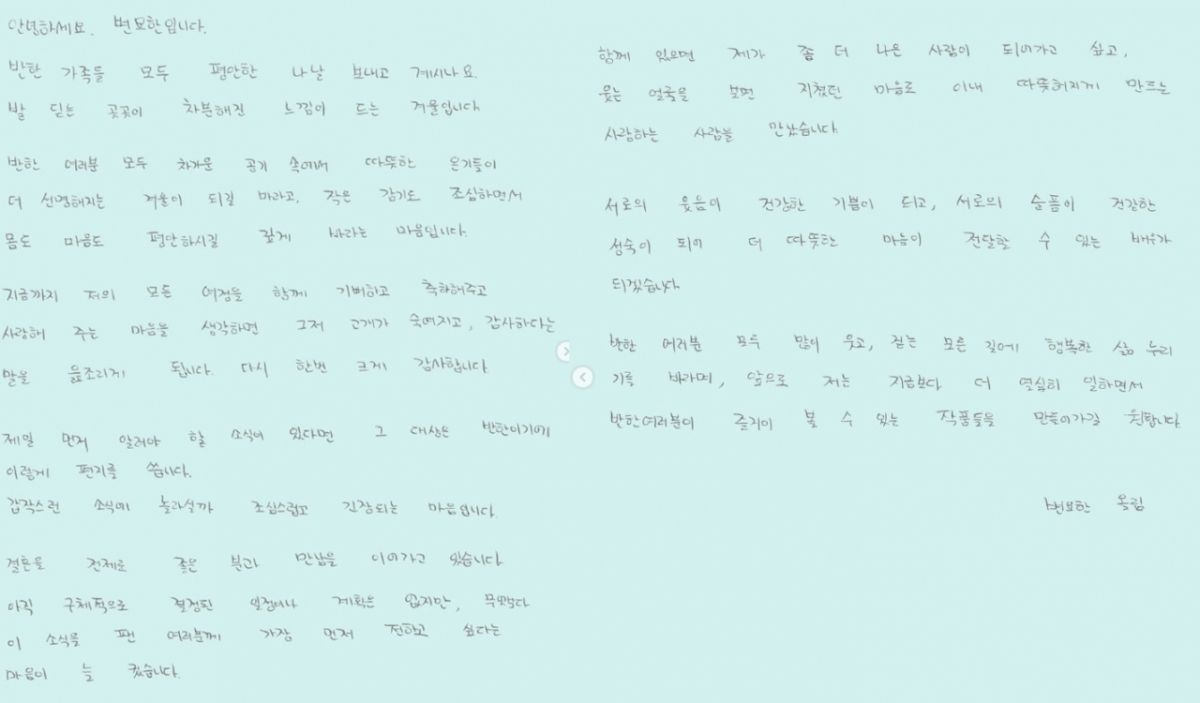 변요한도 손편지 화답 "♥티파니 웃는 얼굴 보며 마음 따뜻해져"[전문]