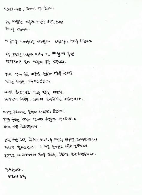이어 "아직 구체적인 일정이 정해지지 않았지만 앞으로 중요한 결정이 생기면 팬 여러분께 먼저 직접 전하겠다"라며 "응원해주시고 따뜻한 시선으로 지켜봐 주셔서 감사하다. 그 마음 잊지 않고 소중히 간직하며 제 자리에서 최선을 다하겠다"라고 밝혔다.