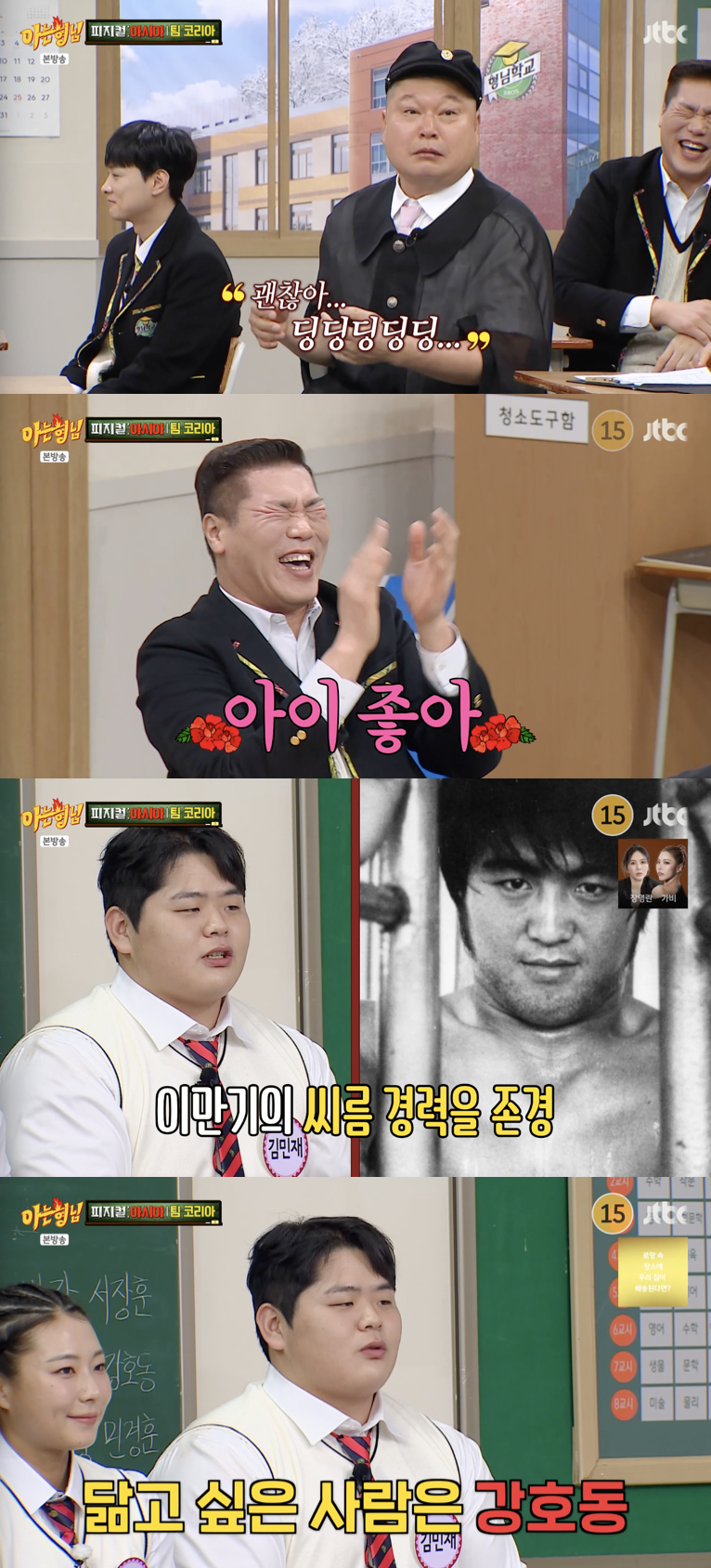 씨름선수 김민재가 자신이 가장 존경하는 선수로 이만기를 꼽았다.13일 방송된 JTBC 예능 프로그램 '아는 형님'에는 넷플릭스 예능 '피지컬: 아시아' 팀 코리아 멤버 최승연, 윤성빈, 아모디, 김민재, 장은실이 전학생으로 출연했다.