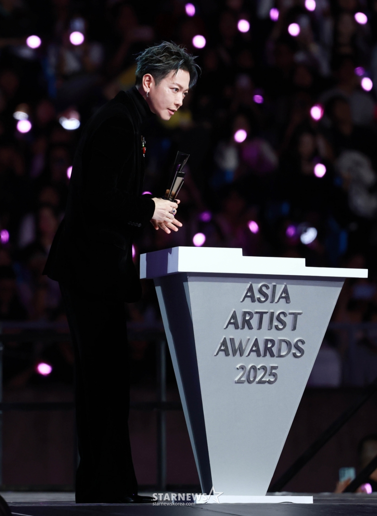일본 배우 사토 타케루가 6일 대만 가오슝 내셔널 스타디움에서 진행된 스타뉴스 주최 '10주년 아시아 아티스트 어워즈 2025(10th Anniversary Asia Artist Awards 2025, '10주년 AAA 2025')에서 AAA Asia Star상을 받고 수상소감을 말하고 있다.