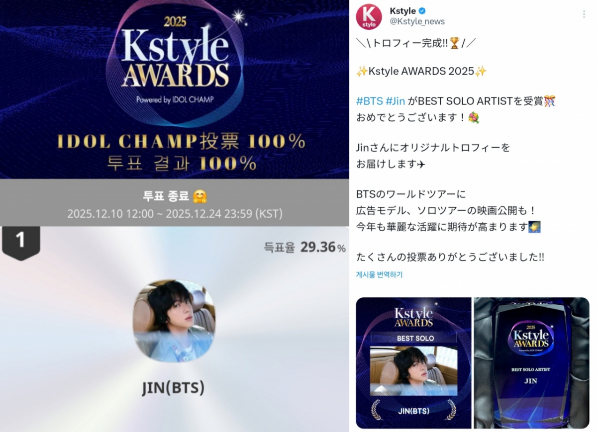 Kstyle과 아이돌 챔프(IDOLCHAMP)가 공동으로 진행한 이번 시상식은 2025년 한 해 동안 활약한 아티스트 가운데 최고의 퍼포먼스를 보여준 스타를 선정하는 투표 기반 어워드로, 결과가 100% 팬 투표로만 반영돼 의미를 더했다. 진은 해당 부문에서 득표율 29.36%를 기록하며 쟁쟁한 후보들을 제치고 정상에 올랐고, 이를 통해 변함없는 글로벌 팬덤의 지지와 높은 화제성을 동시에 입증했다.