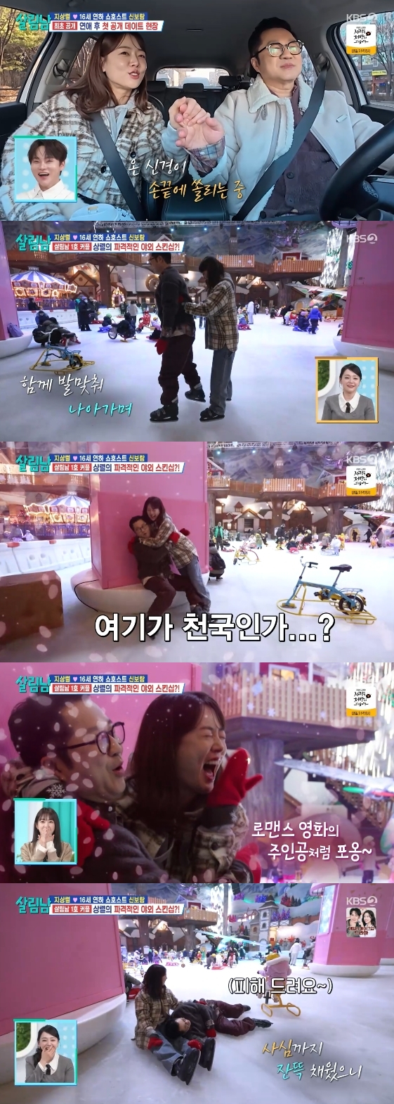 한편 홀로 스케이트 연습에 나선 신보람은 지상렬에게 다가가더니 속도를 줄이지 못하고 그대로 품에 안겨 스튜디오를 발칵 뒤집었다. 갑작스러운 포옹에 놀란 지상렬은 신보람의 행동을 따라 하며 사심 가득한 스킨십을 시도했다. 그는 몸 개그를 빙자해 빙판에 누운 뒤 신보람을 끌어당기는가 하면 무릎을 베어 모두를 경악게 했다.