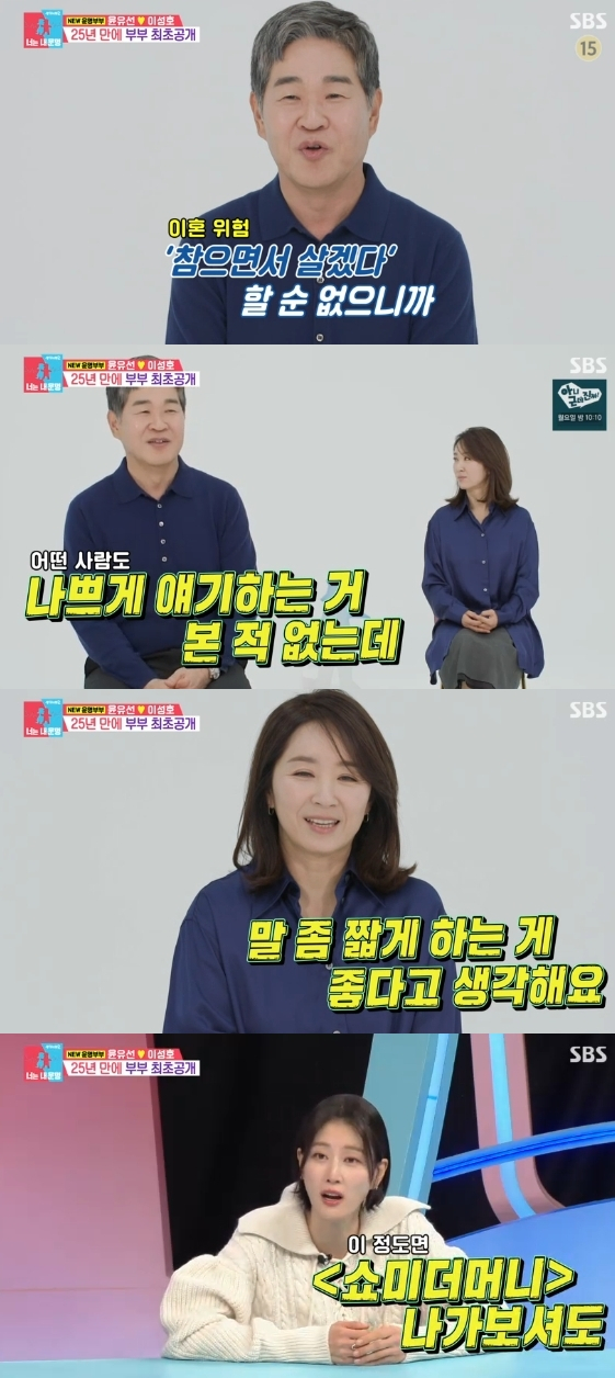 배우 윤유선이 남편의 수다쟁이 면모에 혀를 내둘렀다. 3일 방송된 SBS 예능 프로그램 '동상이몽 시즌2-너는 내 운명'에는 데뷔 52년 차 배우 윤유선이 판사 출신 변호사 이성호와 동반 출연해 25년간의 결혼 생활을 최초 공개했다.