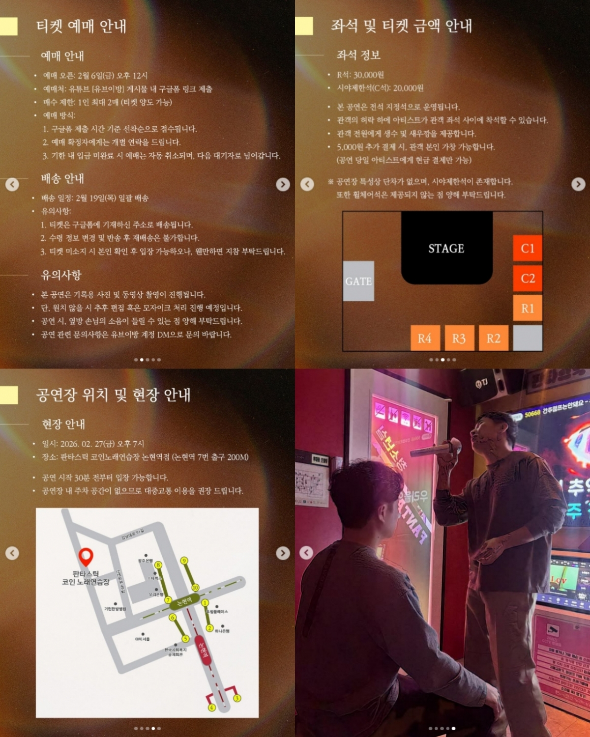 노래방에는 단 6명만 입장이 가능하다. 유세윤의 글로벌 인기에 비하면 턱 없이 부족한 좌석수다. 티켓 가격은 기본석 3만 원, 시야제한석 2만 원이다. 관객이 허락한다면 아티스트가 관객 좌석 사이에 착석할 수도 있으며, 5000원을 추가 결제하면 관객 본인이 가창할 수도 있다.