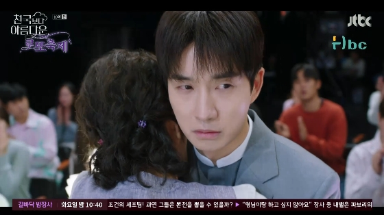 18일 방송된 JTBC 토일드라마 '천국보다 아름다운'에서는 솜이(한지민 분)에게 은호가 이해숙(김혜자 분)과 자신의 아들이라고 밝히는 고낙준(손석구 분)의 모습이 그려졌다.