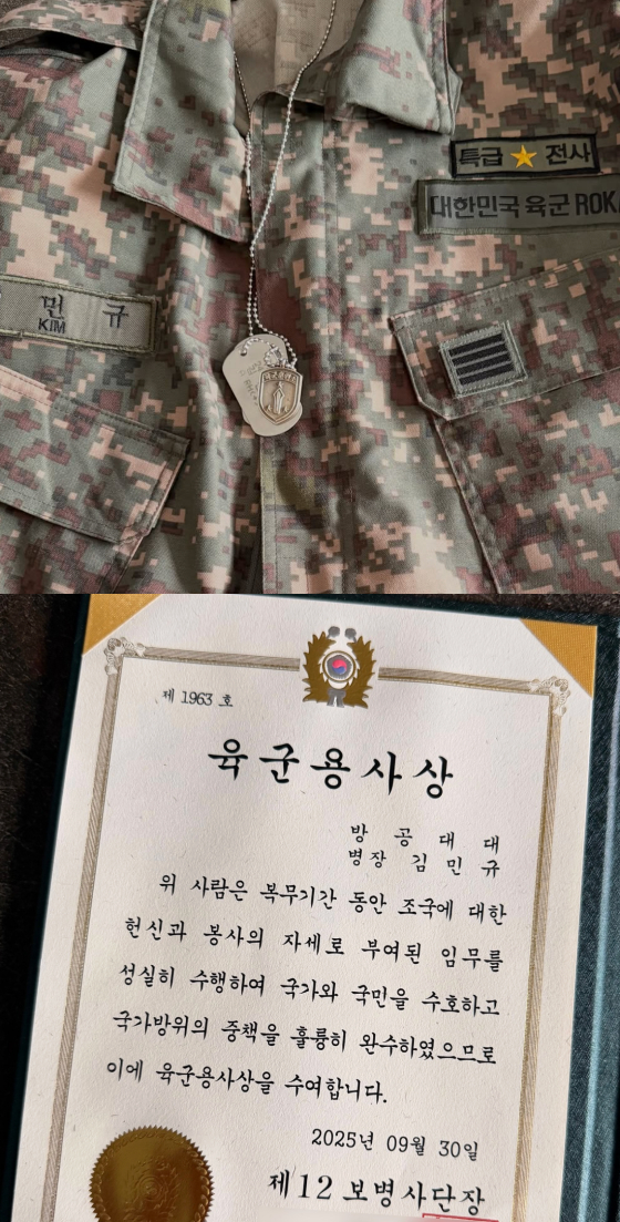 이와 함께 공개된 사진에는 군복을 입은 김민규의 모습이 담겼다. 그는 또, 이날 수여받은 '육군용사상'을 공개하기도 했다.