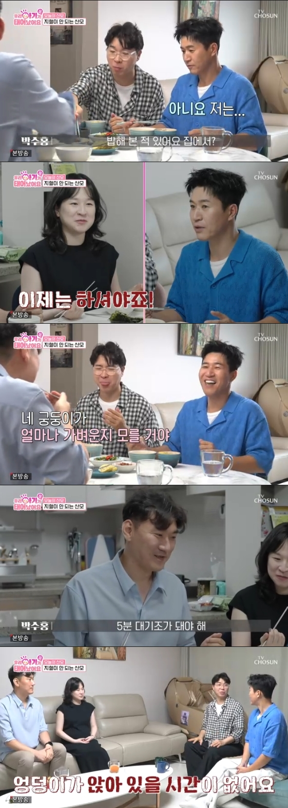 30일 방송된 TV 조선 예능 프로그램 '우리 아기가 또 태어났어요'에는 '출산특파원' 단장 박수홍과 새신랑 김종민이 출산을 앞둔 37주 차 고위험 산모를 만나는 모습이 그려졌다.