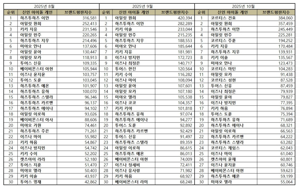 한국기업평판연구소는 신인 아이돌 개인 브랜드평판 빅데이터 분석을 위해 2025년 9월 3일부터 2025년 10월 3일까지 신인 아이돌그룹 브랜드 빅데이터 4,282,272개를 추출했다. 지난 9월 신인 아이돌 개인 브랜드 빅데이터 4,774,261개와 비교하면 10.31% 줄어들었다.
