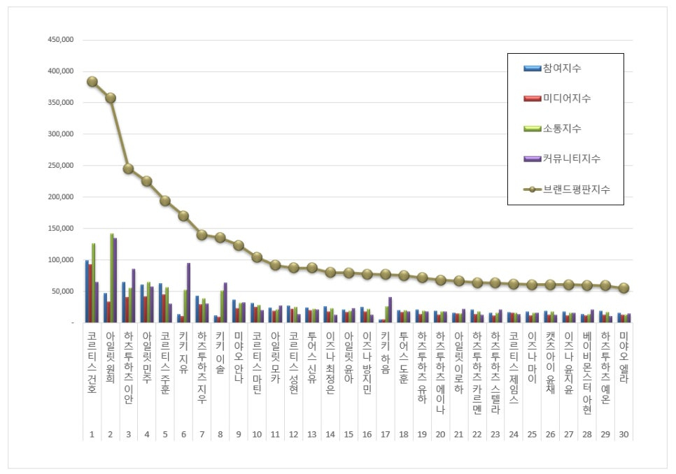 2위, 아일릿 원희 브랜드는 참여지수 47,223 미디어지수 33,455 소통지수 142,083 커뮤니티지수 134,698이 되면서 브랜드평판지수 357,459로 분석됐다. 지난 9월 브랜드평판지수 420,394와 비교해보면 14.97% 하락했다.