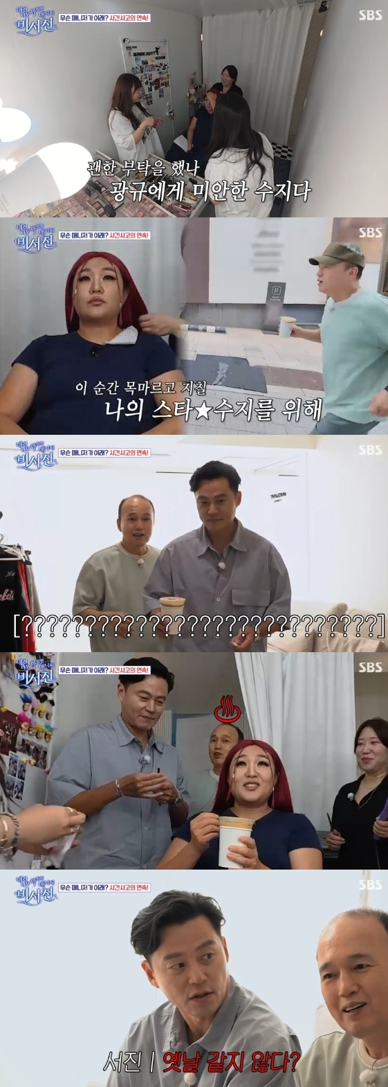 이날 햄부기 메이크업을 받기 위해 샵에 들른 이수지는 목이 마른다며 커피를 요청했다. 이에 김광규는 재빨리 뛰어가 이수지가 주문한 디카페인 아이스라뗴를 구매했다.