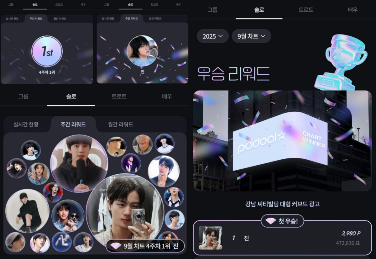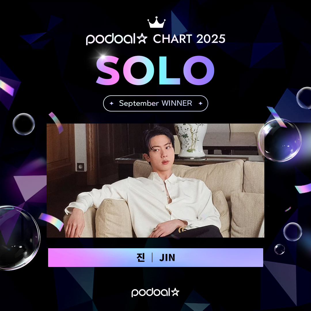 글로벌 팬덤 커뮤니티 플랫폼 '포도알(podoal)'은 9월부터 매월 팬 투표로 진행하는 차트(CHART)를 오픈했다. 그룹·솔로·트로트·배우 총4개 부문에서 주간차트와 월간차트 우승자가 결정되며 진은 솔로부문에서 9월 월간차트 1위를 차지했다.