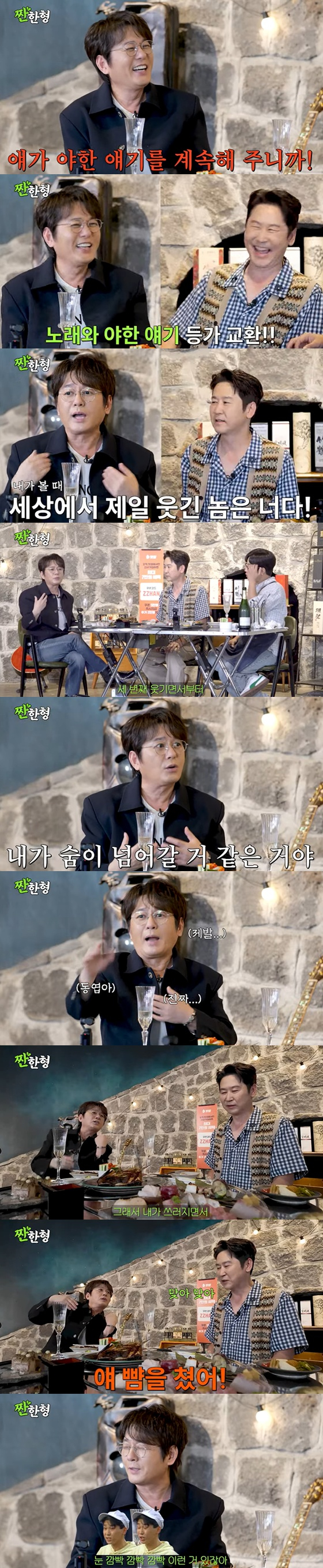이어 그는 "세 번째 웃기면서부터는, 내가 숨이 넘어갈 거 같은 거다. 너무 웃겨서 '그만해'라는 말도 안 나와서, 내가 쓰러지면서 얘 뺨을 친 적이 있다"라는 일화를 꺼냈다.