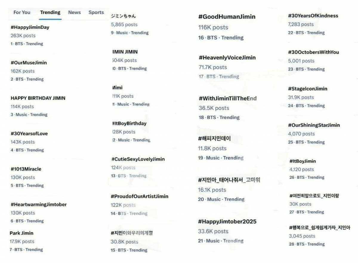한국에서는 단 6분 만에 #지민이와_우리의_계절이 트렌드 1위에 올랐으며, 미국·일본·인도·브라질 등 세계 각국에서도 'HAPPY BIRTHDAY JIMIN'이 각각 1위와 2위를 차지하며 지민의 변함없는 글로벌 영향력을 다시금 증명했다.