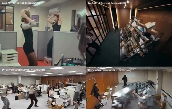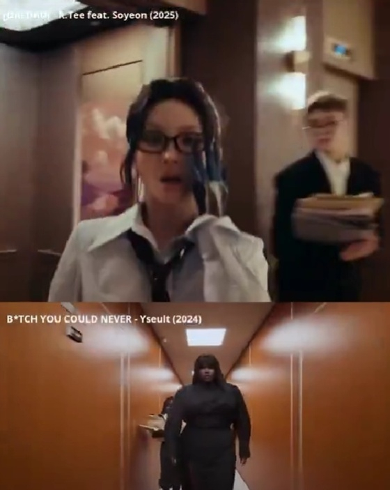 지난해 발매된 이졸트의 'B**** YOU COULD NEVER'와 지난 8월 발매된 알티의 '담다디' 두 뮤직비디오를 비교해보면, 복도를 걸어 나오는 장면과 책장을 넘어트리는 장면 등 곳곳에 비슷한 장면이 등장했다.
