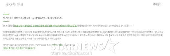 이어 "본 게시물은 정보통신망 이용촉진 및 정보보호 등에 관한 법률 제44조의2(정보의 삭제요청 등)의 법령을 준수하기 위해 게시 중단(임시조치) 됐다"고 전했다.